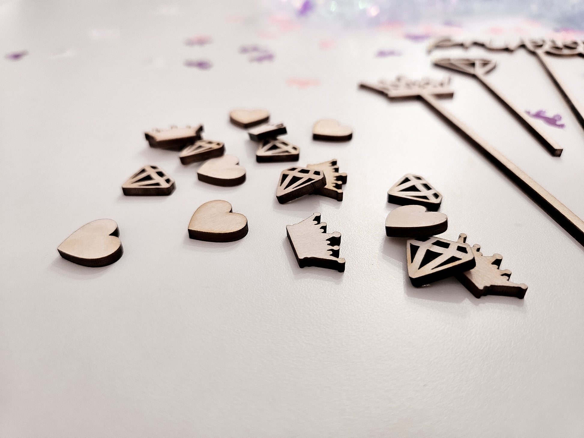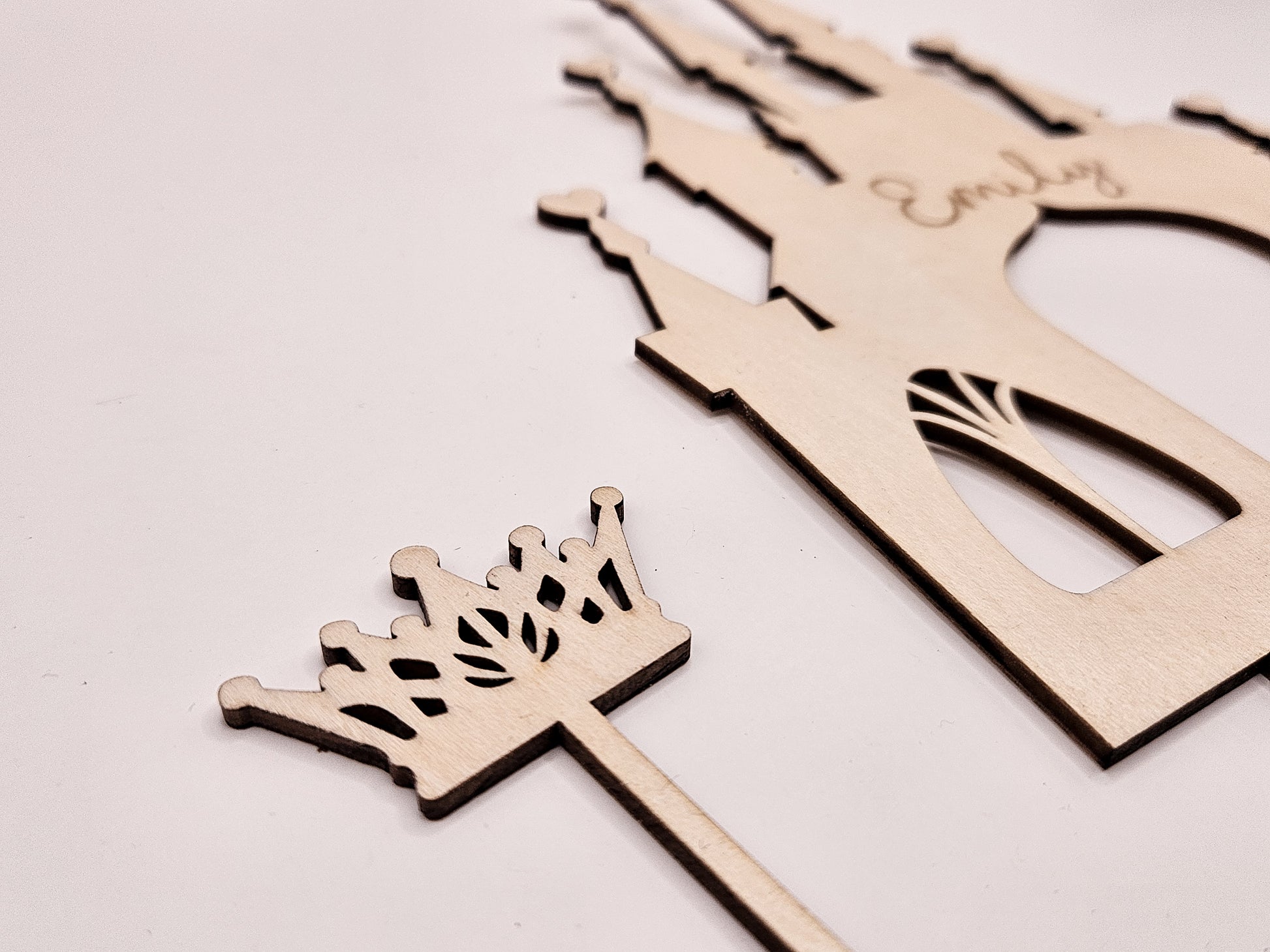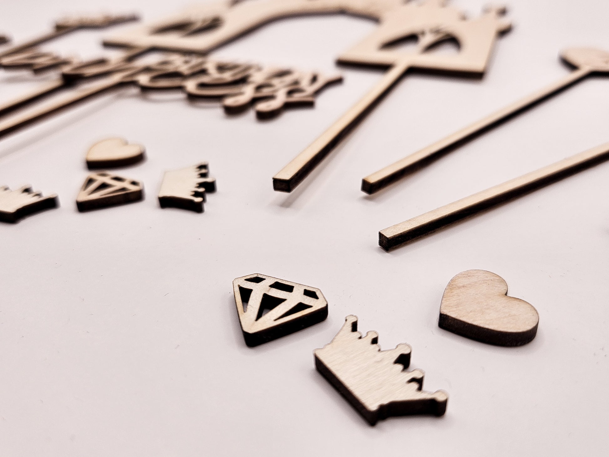 Lieferumfang: Schloss-Topper, „Birthday Princess“-Schriftzug, Herzen, Holzdiamanten & kleine Holzdeko-Elemente